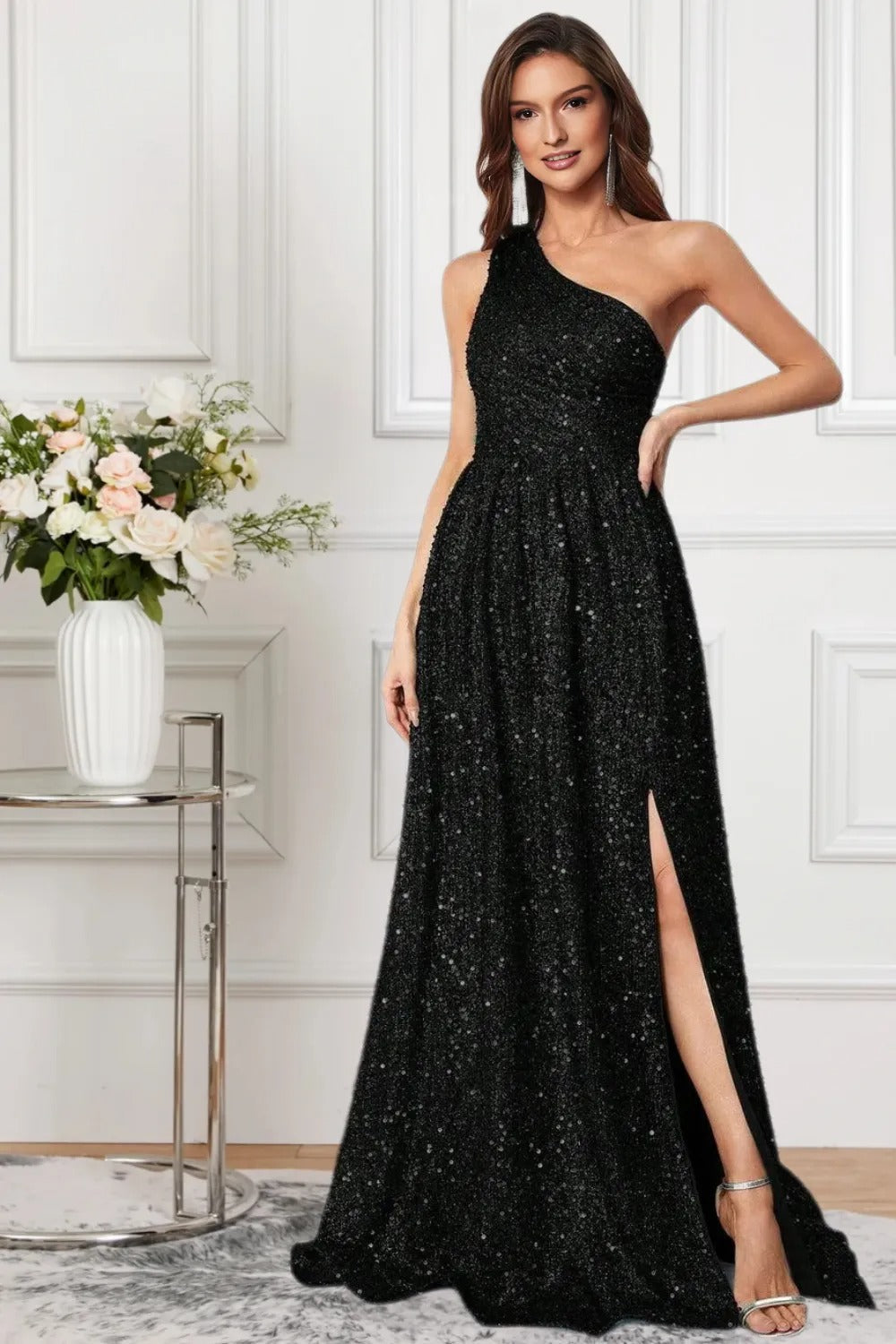 Dressime Plus Size Sparkly Sheath One Shoulder Metallic Long Formal Dress