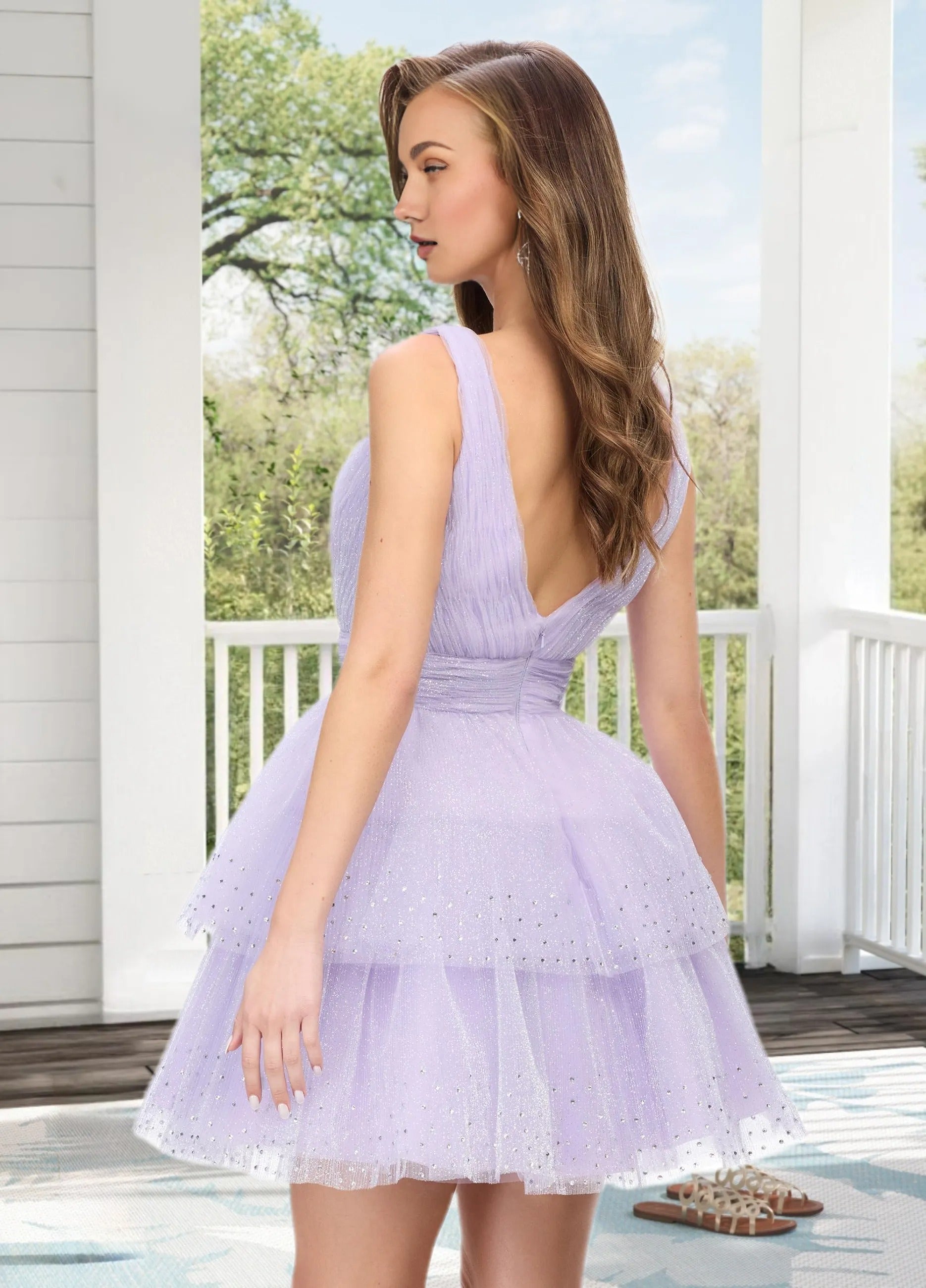 Dressime A Line Illusion V Neck Tulle Tiered Mini Homecoming Dress
