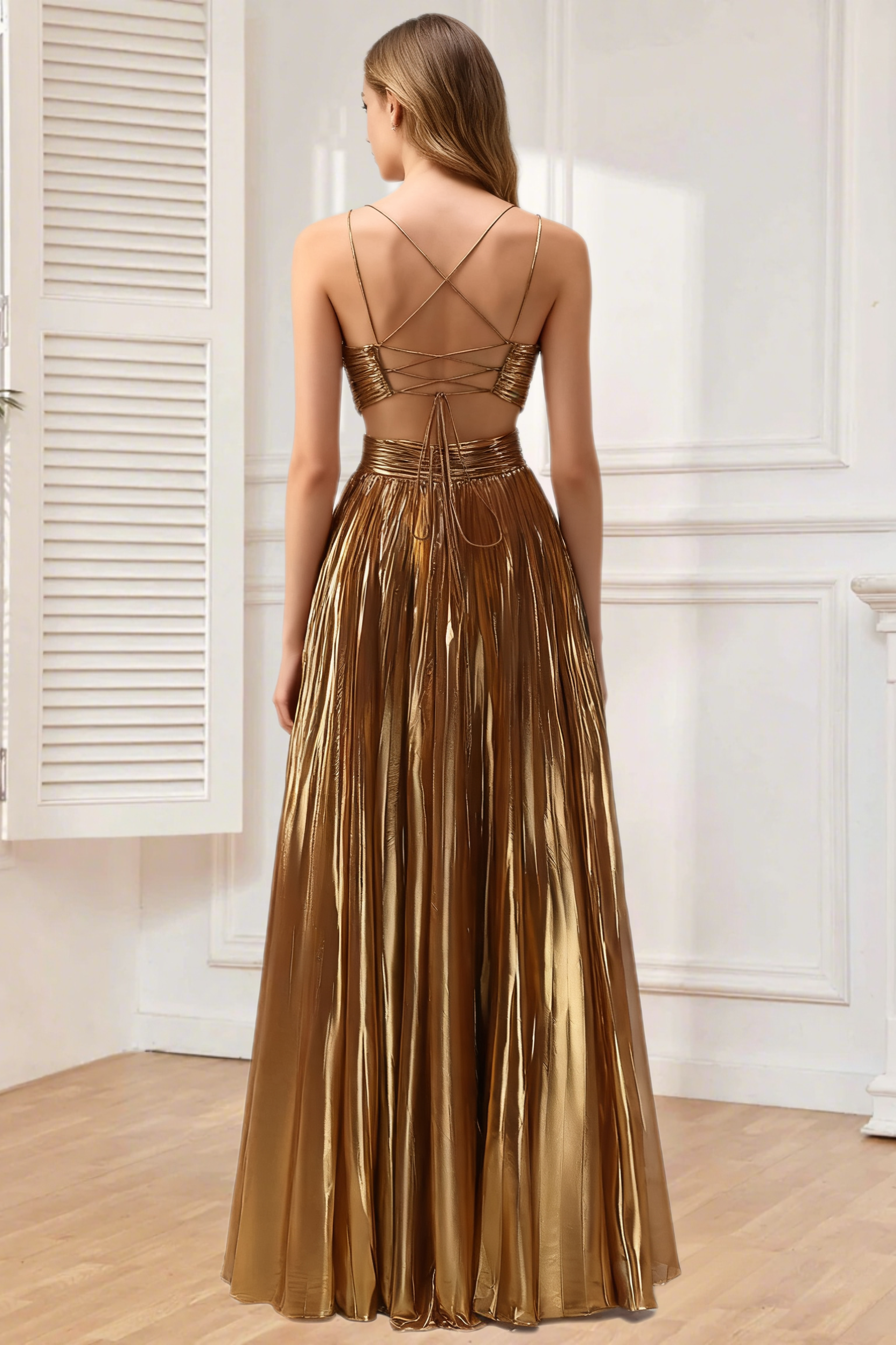 Dressime A Line Spaghetti Straps Metallic Long Prom Dress