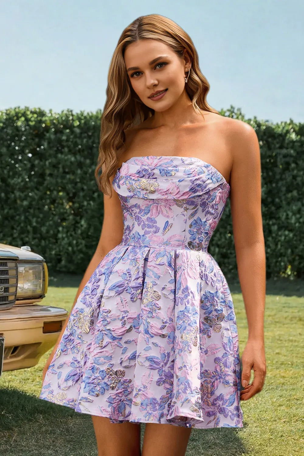 Dressime A Line Strapless Floral Jacquard Mini Homecoming Dress