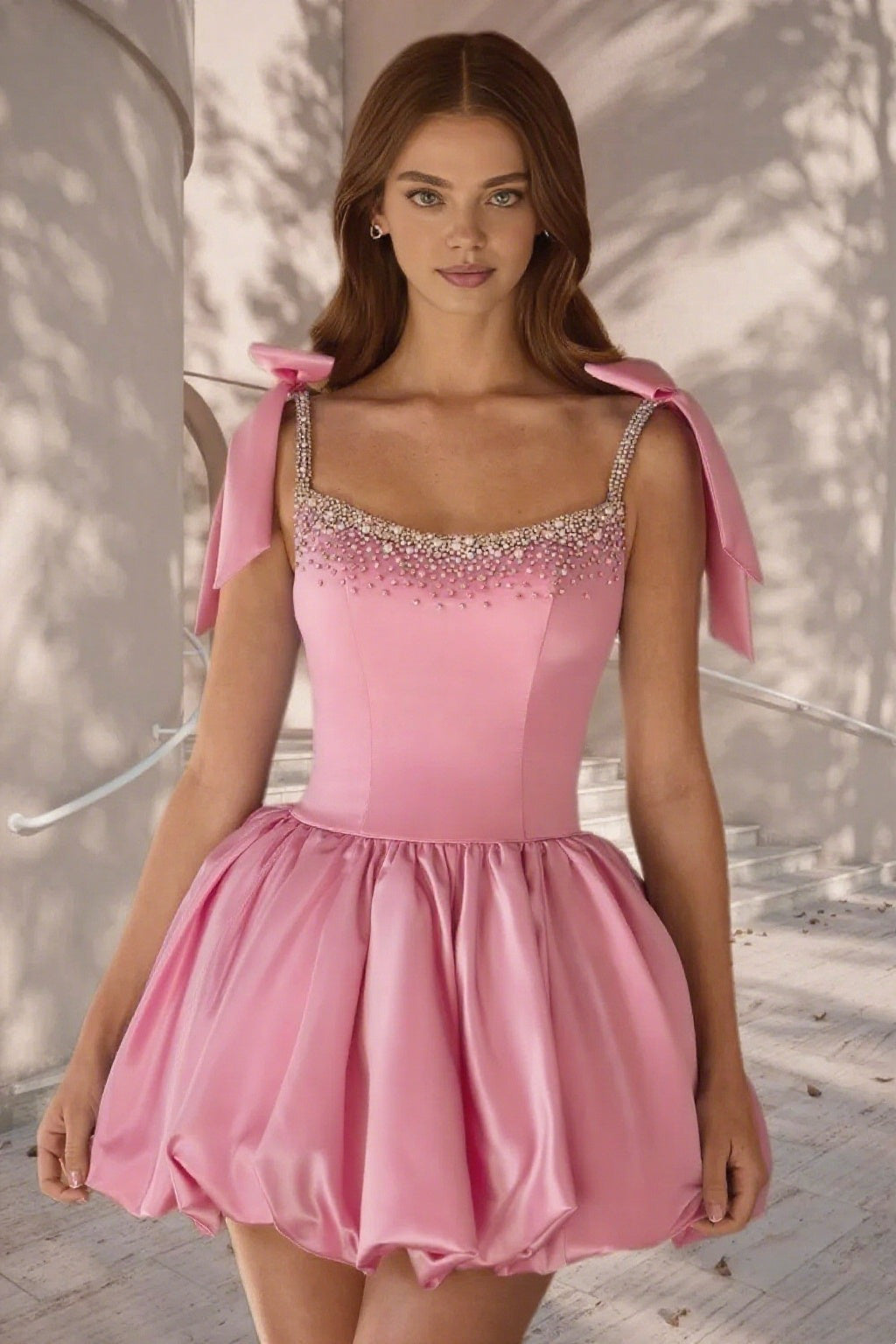 Dressime A Line Tie Bow Straps Satin Beaded Short/Mini Homecoming Dress