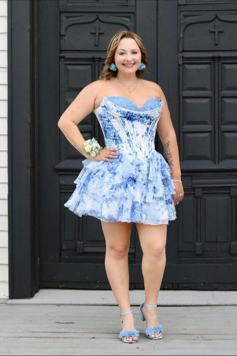 The dress is so cute. The fabric has floral features that I didn’t expect. The corset makes me look real cinched and emphasizes my hourglass shape. This is an amazing dress in general, esp with the affordable price point.