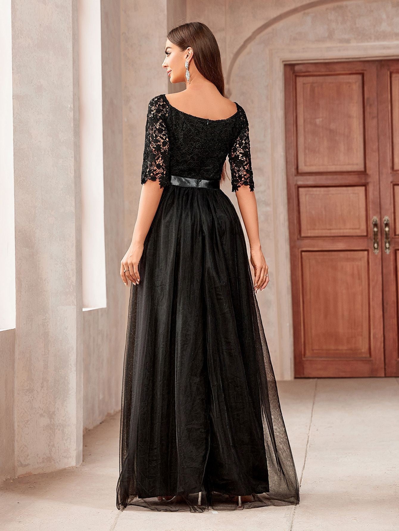 Dressime Stylish A Line V Neck Tulle Lace Half Sleeves Long Formal Dress With Belt